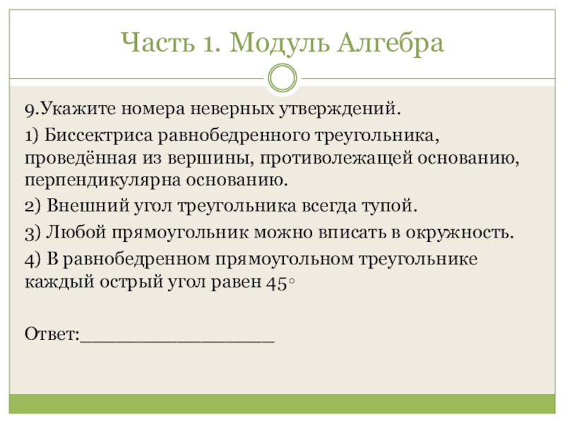 Часть 1. Модуль Алгебра 9.Укажите номера неверных утверждений.1) Биссектриса равнобедренного треугольника, проведённая из вершины, противолежащей основанию, перпендикулярна