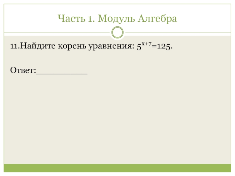 Часть 1. Модуль Алгебра 11.Найдите корень уравнения: 5x+7=125.Ответ:_________