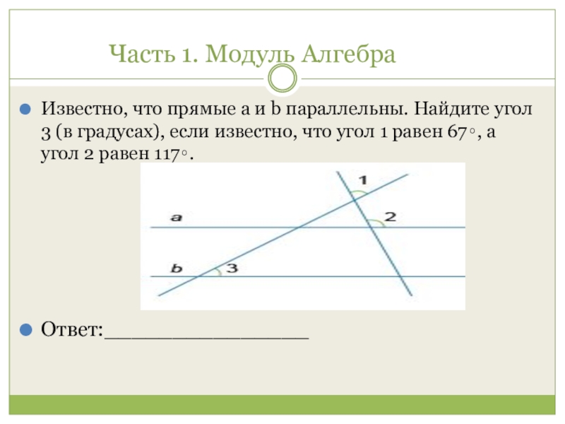Часть 1. Модуль Алгебра Известно, что прямые a и b параллельны. Найдите угол 3 (в градусах), если