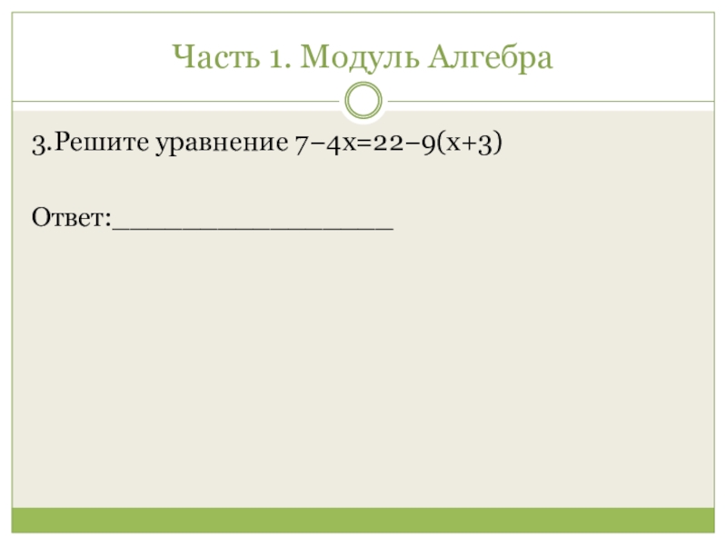 Часть 1. Модуль Алгебра 3.Решите уравнение 7−4x=22−9(x+3)Ответ:________________