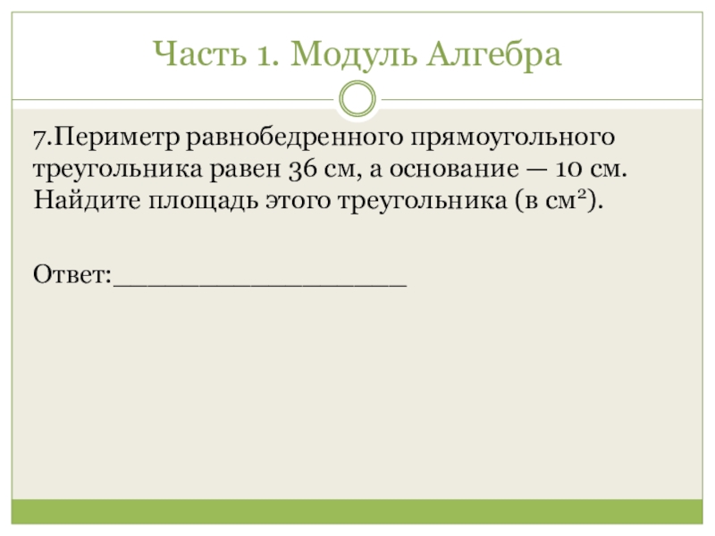 Часть 1. Модуль Алгебра 7.Периметр равнобедренного прямоугольного треугольника равен 36 см, а основание — 10 см. Найдите