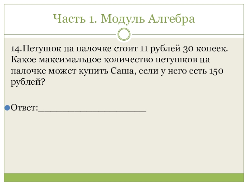 Часть 1. Модуль Алгебра 14.Петушок на палочке стоит 11 рублей 30 копеек. Какое максимальное количество петушков на