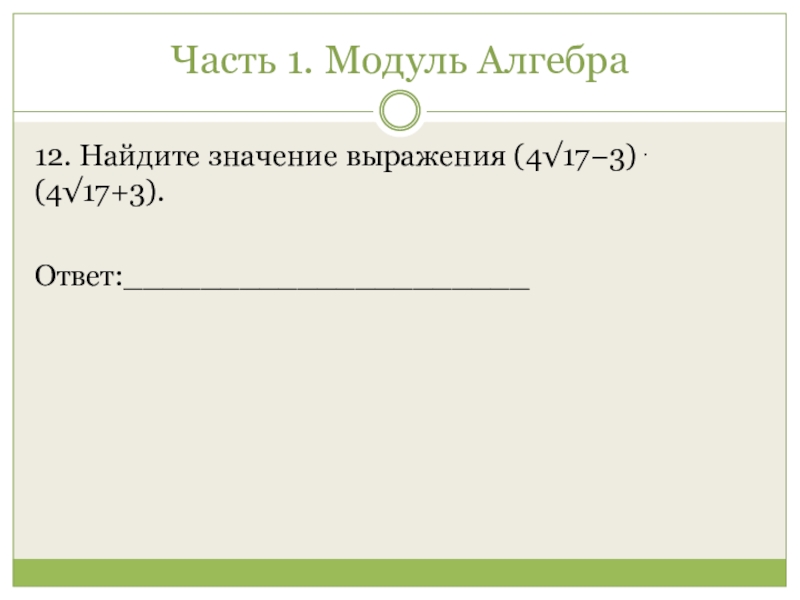 Часть 1. Модуль Алгебра 12. Найдите значение выражения (4√17−3)⋅(4√17+3).Ответ:_____________________