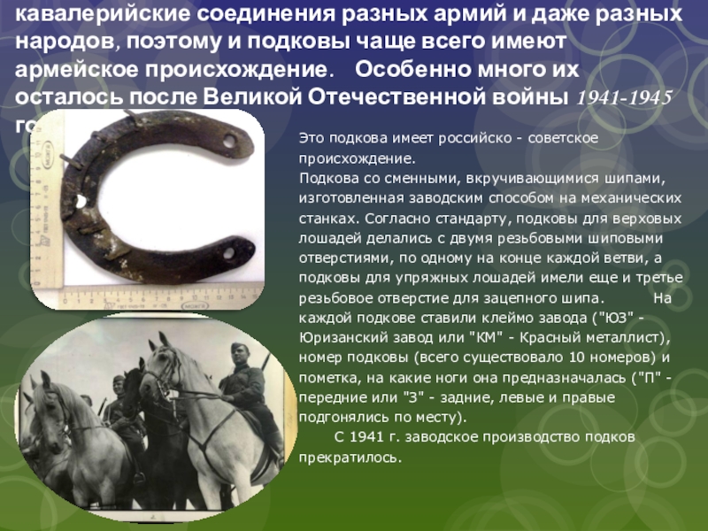 даже разных народов, поэтому и подковы чаще всего имеют армейское происхождение. Особенно много их осталось после Великой Отечественной войны 1941-1945 годов.