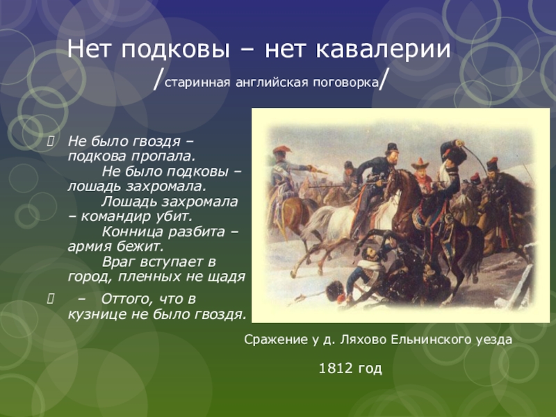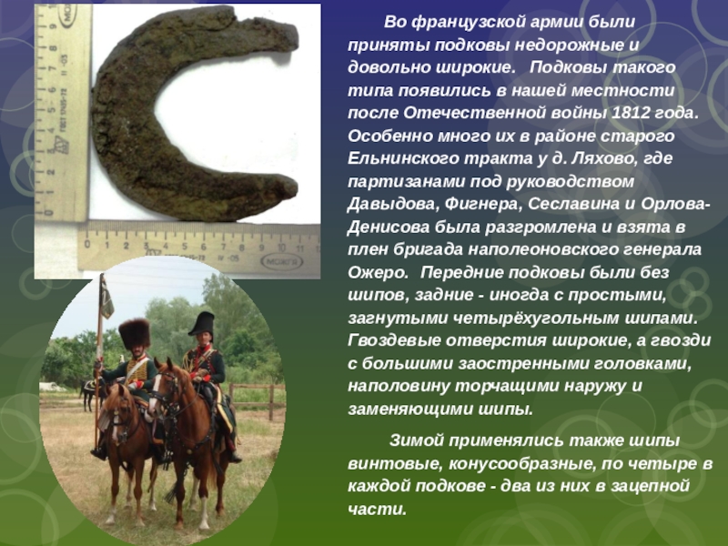 Слайд 10 Во французской армии были приняты подковы недорожные и довольно широкие. Подковы