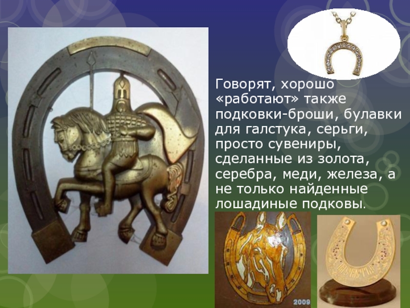 Слайд 11Говорят, хорошо «работают» также подковки-броши, булавки для галстука, серьги, просто сувениры,