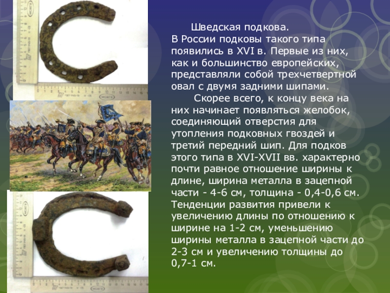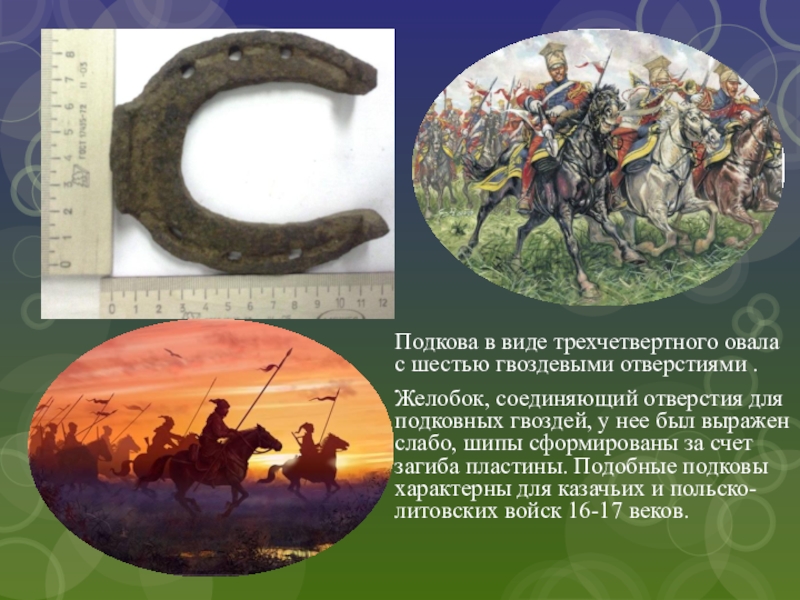Слайд 9Подкова в виде трехчетвертного овала с шестью гвоздевыми отверстиями .