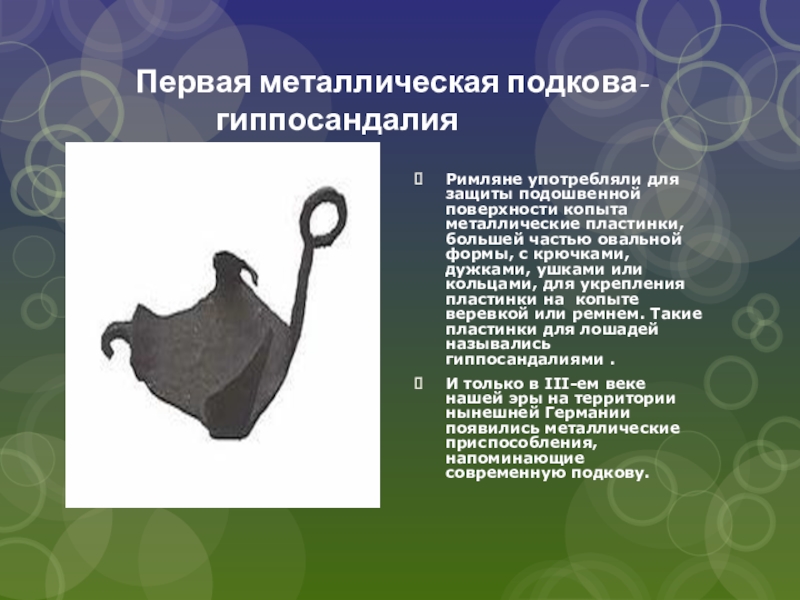 Римляне употребляли для защиты подошвенной поверхности копыта металлические пластинки, большей частью овальной формы, с крючками, дужками, ушками или кольцами, для укрепления пластинки на копыте веревкой или ремнем. Такие пластинки для лошадей назывались гиппосандалиями .