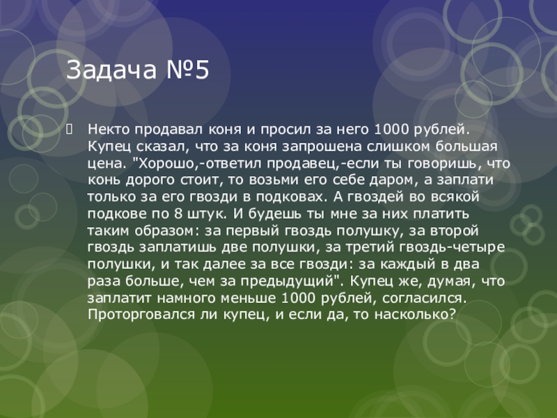 сказал, что за коня запрошена слишком большая цена. "Хорошо,-ответил продавец,-если ты говоришь, что конь дорого стоит, то возьми его себе даром, а заплати только за его гвозди в подковах. А гвоздей во всякой подкове по 8 штук. И будешь ты мне за них платить таким образом: за первый гвоздь полушку, за второй гвоздь заплатишь две полушки, за третий гвоздь-четыре полушки, и так далее за все гвозди: за каждый в два раза больше, чем за предыдущий". Купец же, думая, что заплатит намного меньше 1000 рублей, согласился. Проторговался ли купец, и если да, то насколько?