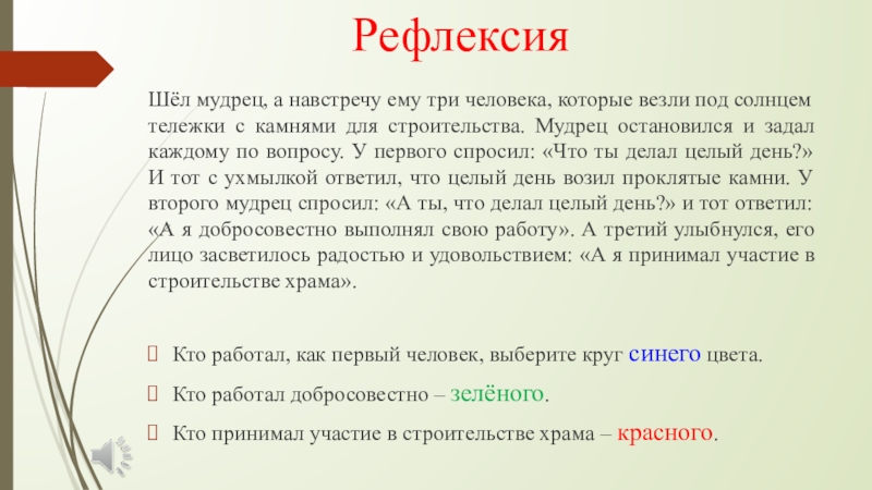 РефлексияШёл мудрец, а навстречу ему три человека, которые везли под солнцем тележки с камнями для строительства. Мудрец