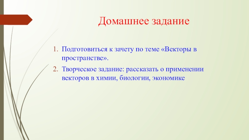 Домашнее заданиеПодготовиться к зачету по теме «Векторы в пространстве».Творческое задание: рассказать о применении векторов в химии, биологии,