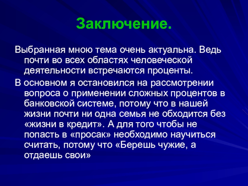 В основном я остановился на рассмотрении вопроса о применении сложных процентов в банковской системе, потому что в нашей жизни почти ни одна семья не обходится без «жизни в кредит». А для того чтобы не попасть в «просак» необходимо научиться считать, потому что «Берешь чужие, а отдаешь свои»
