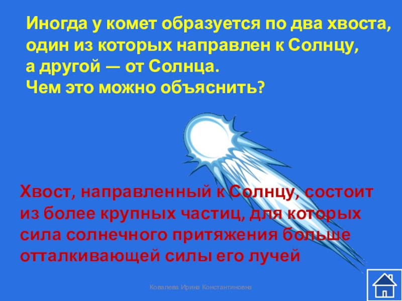 Хвост, направленный к Солнцу, состоит из более крупных частиц, для которых сила солнечного притяжения больше отталкивающей силы его лучей