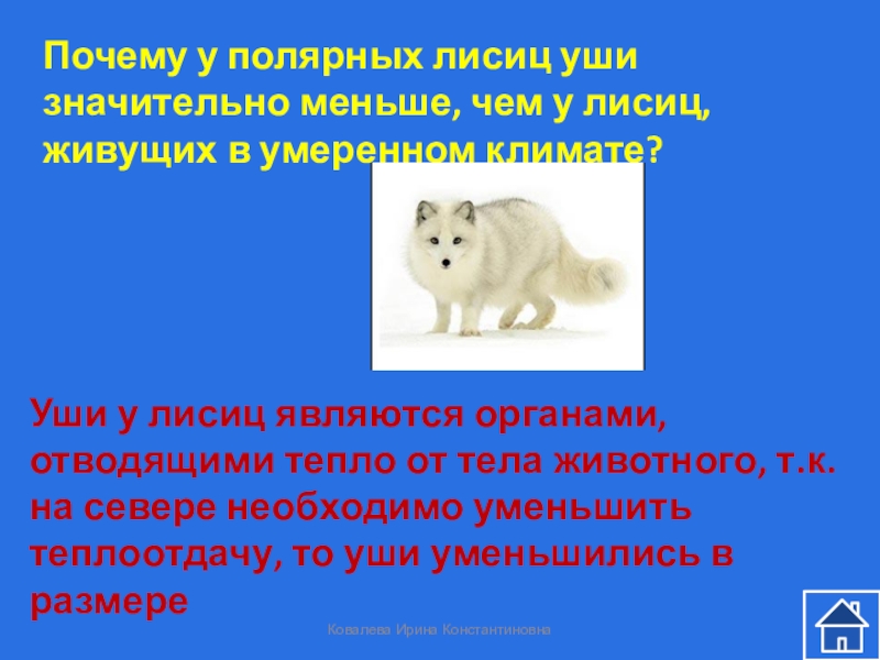 Уши у лисиц являются органами, отводящими тепло от тела животного, т.к. на севере необходимо уменьшить теплоотдачу, то уши уменьшились в размере