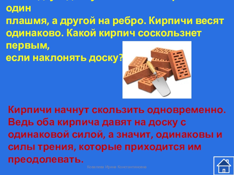 Кирпичи начнут скользить одновременно. Ведь оба кирпича давят на доску с одинаковой силой, а значит, одинаковы и силы трения, которые приходится им преодолевать.