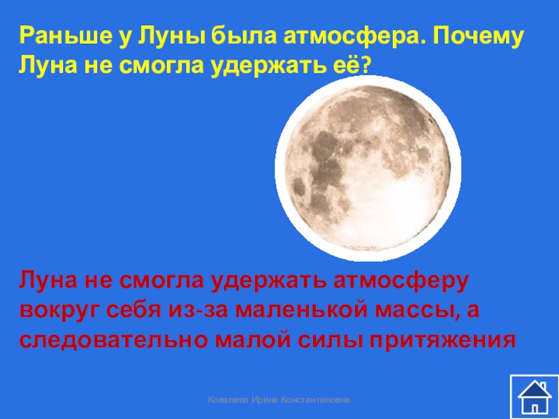 Луна не смогла удержать атмосферу вокруг себя из-за маленькой массы, а следовательно малой силы притяжения