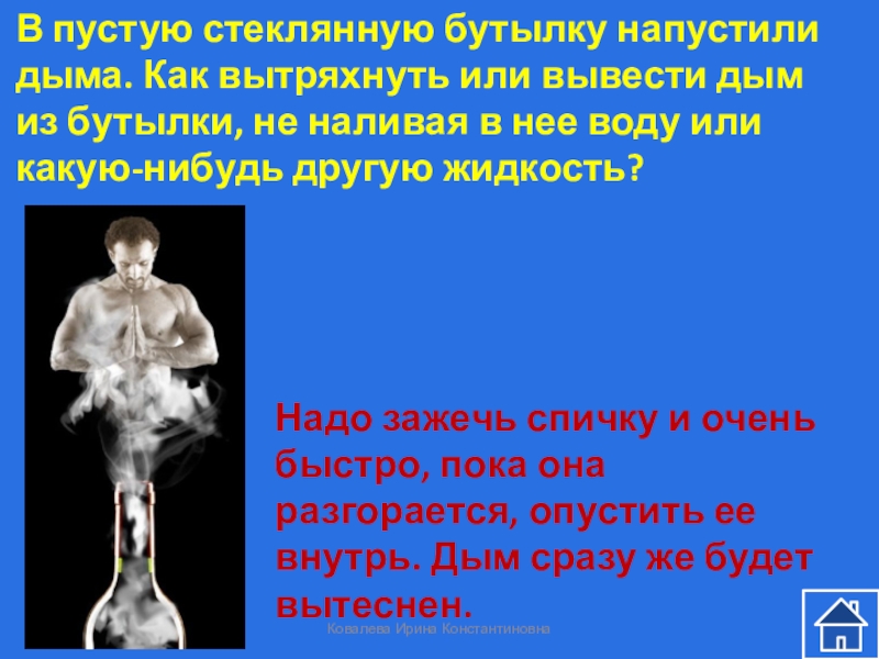 Надо зажечь спичку и очень быстро, пока она разгорается, опустить ее внутрь. Дым сразу же будет вытеснен.