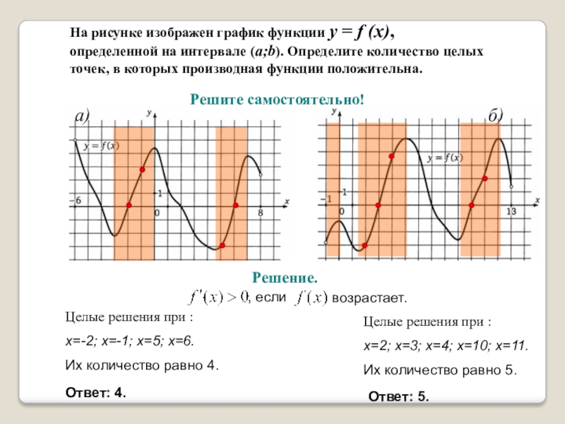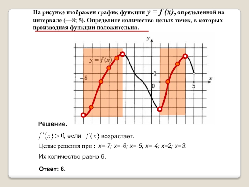 Решим эту задачу, воспользовавшись следующим утверждением. Производная непрерывно дифференцируемой функции на промежутке убывания (возрастания) не положительна (не отрицательна). Значит необходимо выделить промежутки убывания функции и сосчитать количество целых чисел, принадлежащих этим промежуткам. Причем производная равна нулю на концах этих промежутков, значит, нужно брать только внутренние точки промежутков.