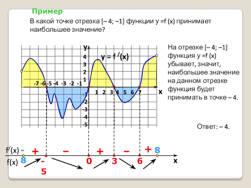 На отрезке [– 4; –1] функция у =f (x) убывает, значит, наибольшее значение на данном отрезке функция будет принимать в точке – 4.
