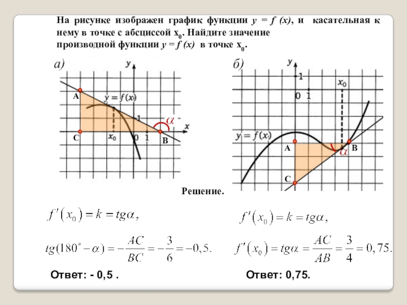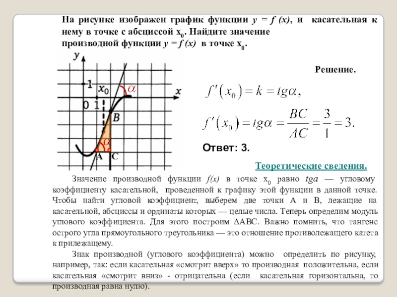 Значение производной функции f(x) в точке х0 равно tga — угловому коэффициенту касательной, проведенной к графику этой функции в данной точке. Чтобы найти угловой коэффициент, выберем две точки А и В, лежащие на касательной, абсциссы и ординаты которых — целые числа. Теперь определим модуль углового коэффициента. Для этого построим ∆ABC. Важно помнить, что тангенс острого угла прямоугольного треугольника — это отношение противолежащего катета к прилежащему.