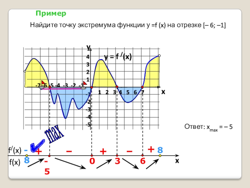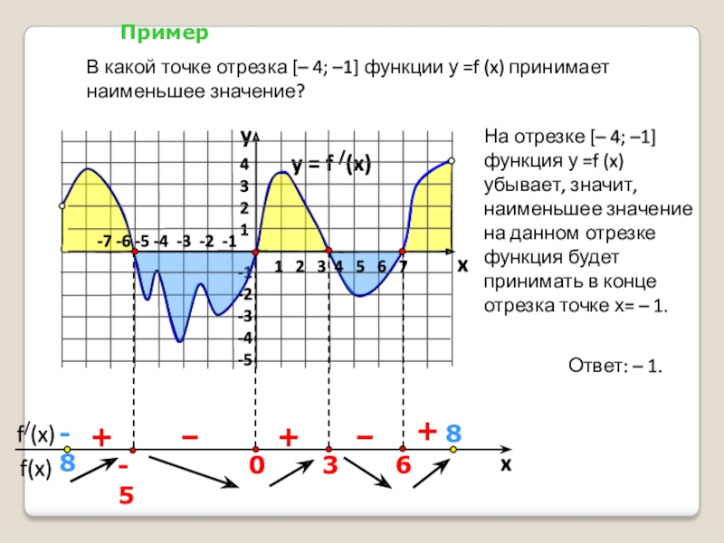 На отрезке [– 4; –1] функция у =f (x) убывает, значит, наименьшее значение на данном отрезке функция будет принимать в конце отрезка точке х= – 1.