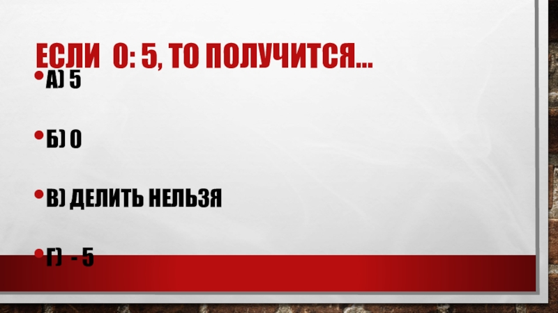 Если 0: 5, то получится…А) 5Б) 0В) делить нельзяГ) - 5