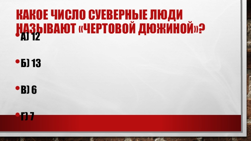 Слайд 4Какое число суеверные люди называют «чертовой дюжиной»?