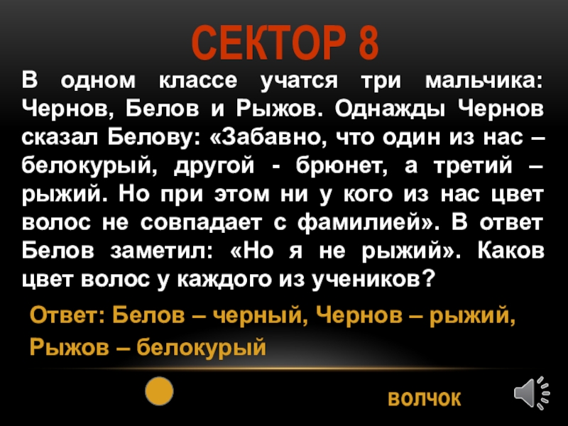 Ответ: Белов – черный, Чернов – рыжий, Рыжов – белокурый
