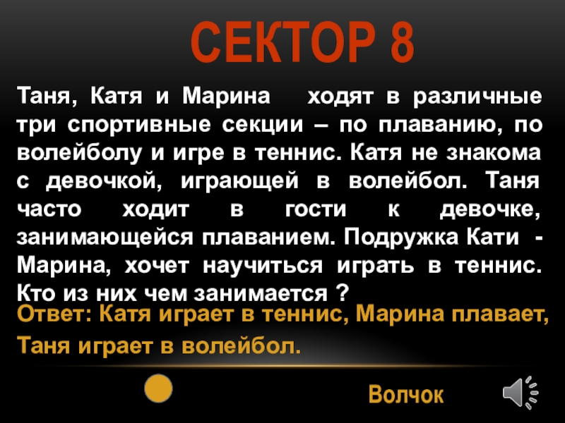 Ответ: Катя играет в теннис, Марина плавает, Таня играет в волейбол.
