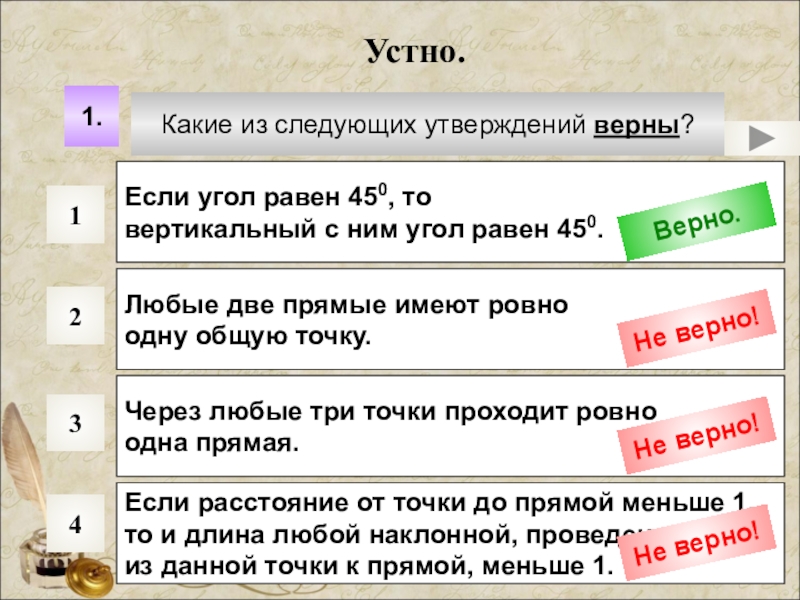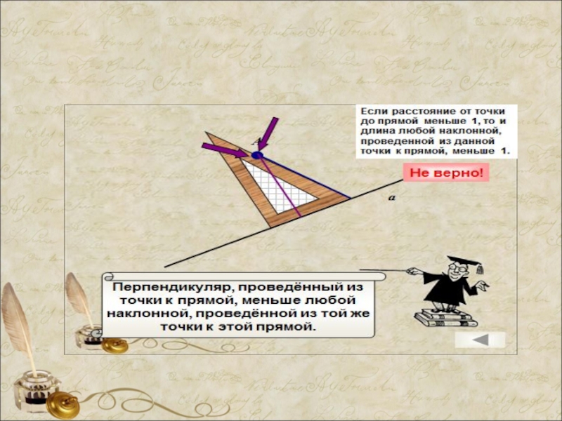 Если при пересечении двух прямых секущей внутренние накрест лежащие углы составляют в сумме 900, то эти две прямые параллельны.