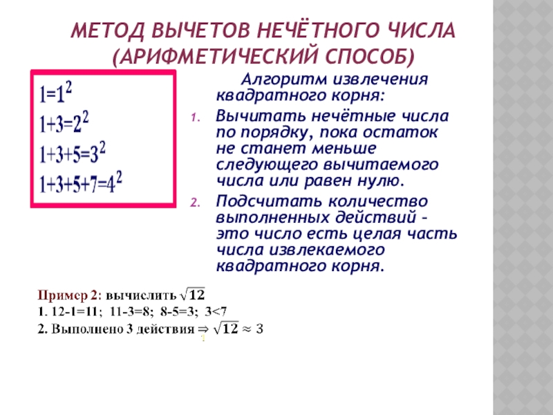 Метод вычетов нечётного числа (арифметический способ) Алгоритм извлечения квадратного корня:Вычитать нечётные числа по порядку, пока остаток не станет меньше следующего вычитаемого числа или равен нулю. Подсчитать количество выполненных действий – это число