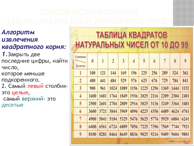 Способ использования  таблиц квадратов и двузначных чиселАлгоритм извлечения квадратного корня: 1.Закрыть две последние цифры, найти число,