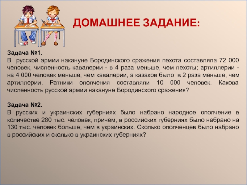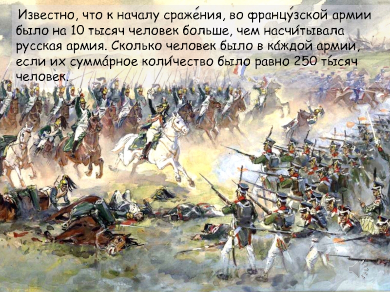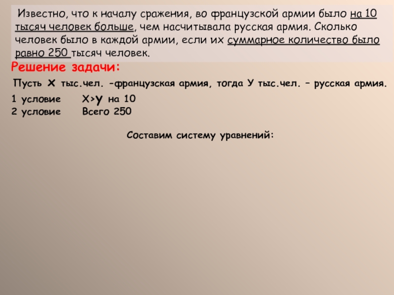 Известно, что к началу сражения, во французской армии было на 10 тысяч человек больше, чем насчитывала русская армия. Сколько человек было в каждой армии, если их суммарное количество было равно 250 тысяч человек.