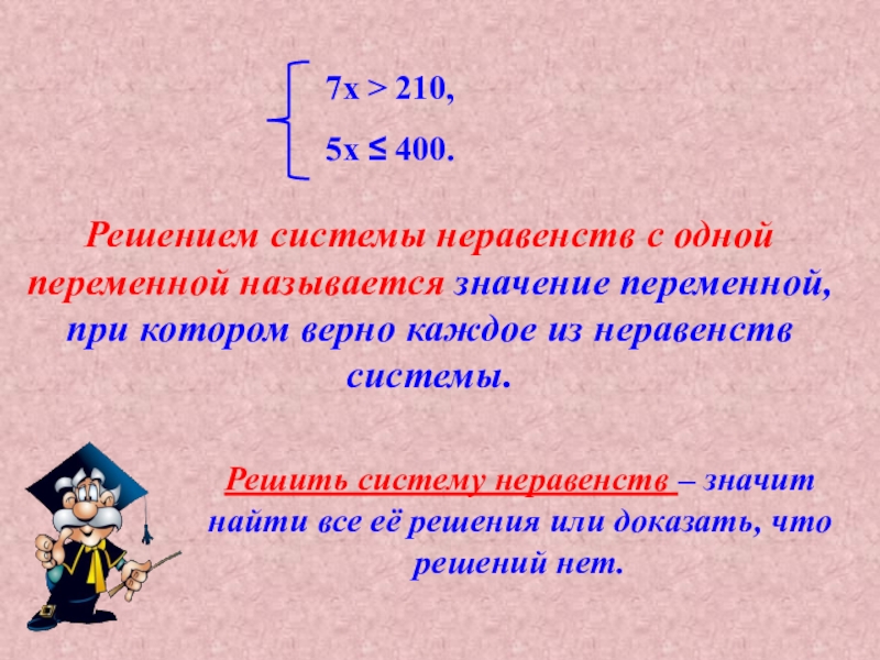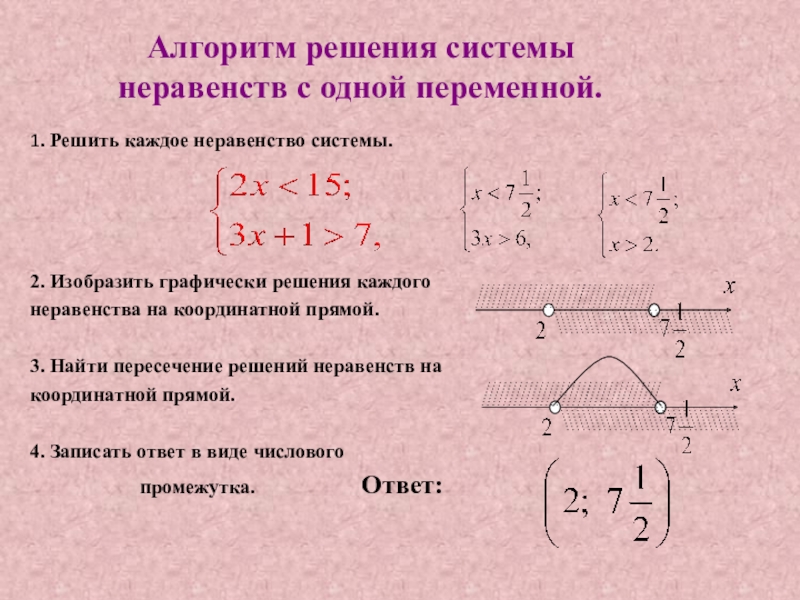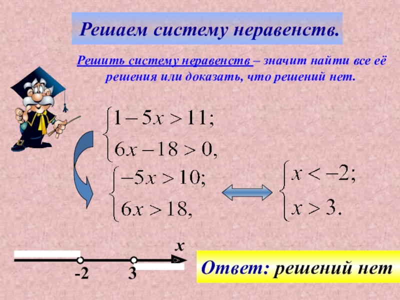 Решением системы неравенств с одной переменной называется значение переменной, при котором верно каждое из неравенств системы.