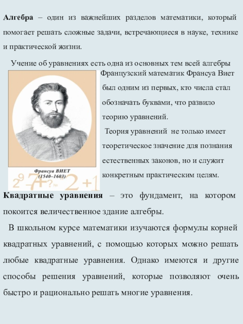 Учение об уравнениях есть одна из основных тем всей алгебры