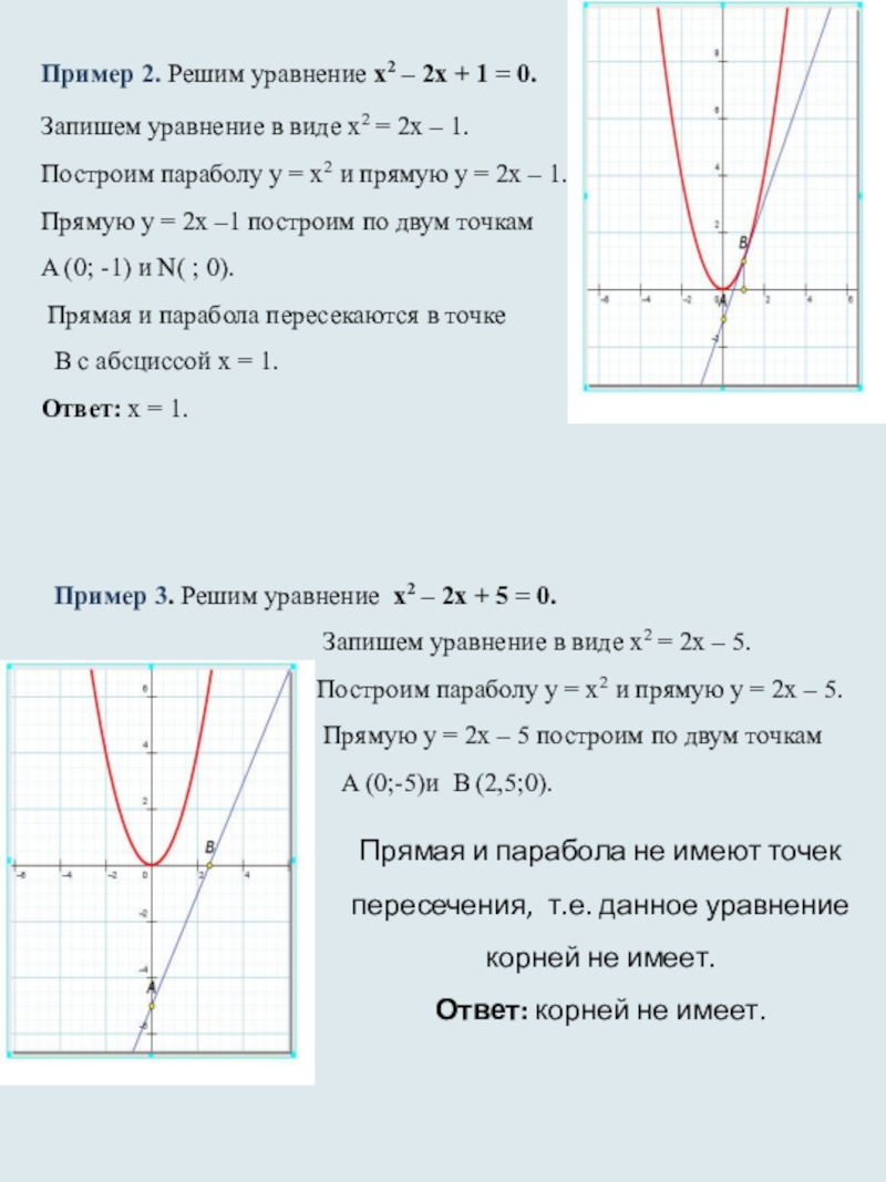Прямая и парабола не имеют точек пересечения, т.е. данное уравнение корней не имеет.