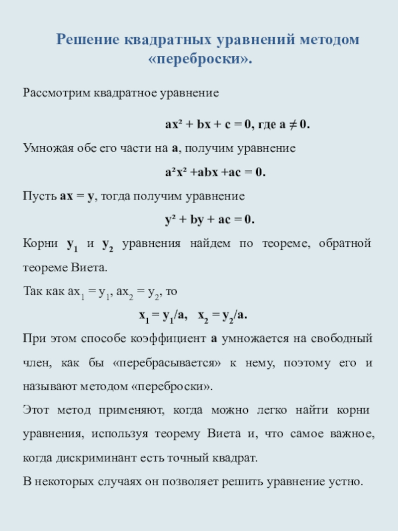 В школьном курсе математики изучаются формулы корней квадратных уравнений, с помощью которых можно решать любые квадратные уравнения. Однако имеются и другие способы решения уравнений, которые позволяют очень быстро и рационально решать многие уравнения.