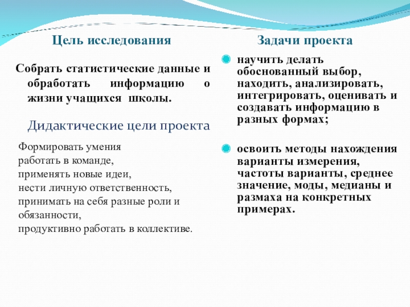освоить методы нахождения варианты измерения, частоты варианты, среднее значение, моды, медианы и размаха на конкретных примерах.