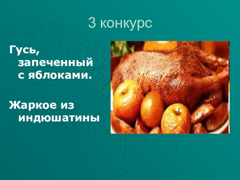 3 конкурсГусь, запеченный с яблоками.Жаркое из индюшатины