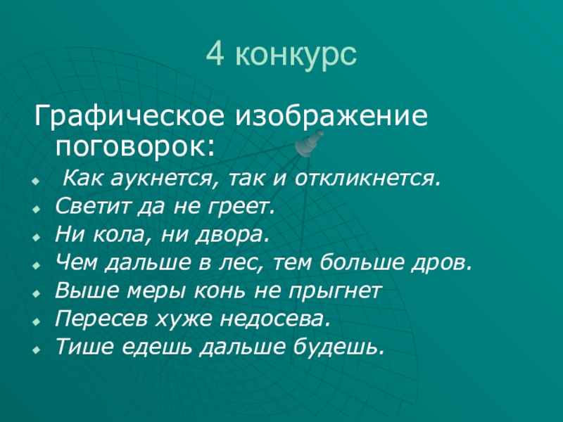4 конкурсГрафическое изображение поговорок: Как аукнется, так и откликнется.Светит да не греет.Ни кола, ни двора.Чем дальше в
