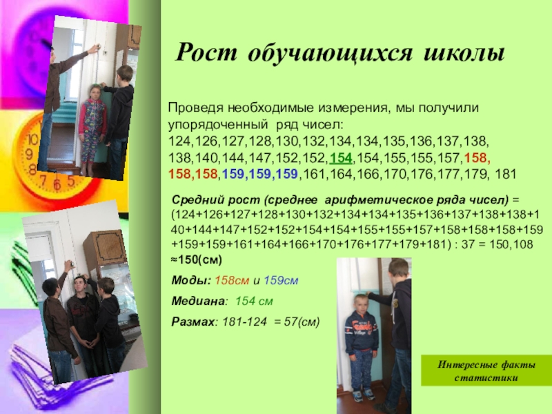 Средний рост (среднее арифметическое ряда чисел) = (124+126+127+128+130+132+134+134+135+136+137+138+138+140+144+147+152+152+154+154+155+155+157+158+158+158+159+159+159+161+164+166+170+176+177+179+181) : 37 = 150,108 ≈150(см)