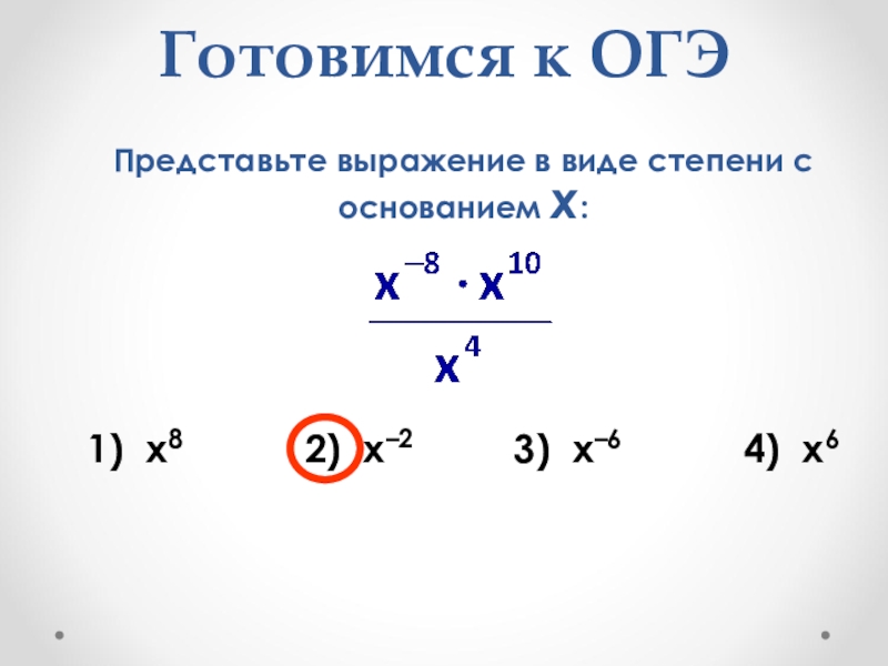 Готовимся к ОГЭПредставьте выражение в виде степени с основанием х:1) х8