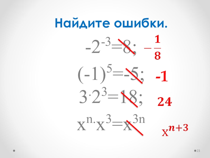 Найдите ошибки.-2-3=8; (-1)5=-5; 3.23=18; хn.х3=х3n   -1
