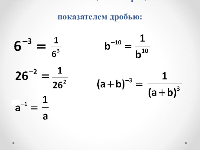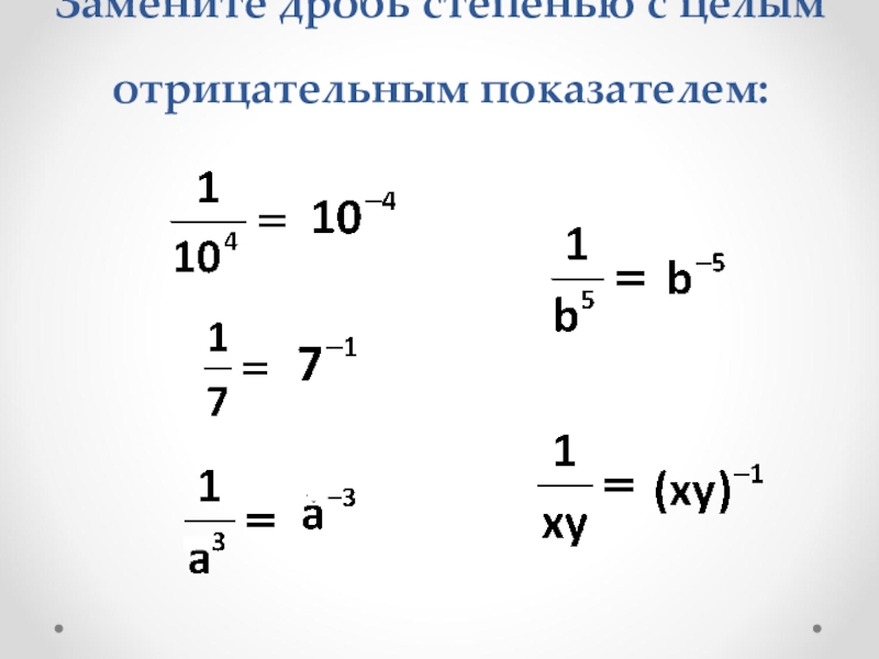 Слайд 22Замените дробь степенью с целым отрицательным показателем: