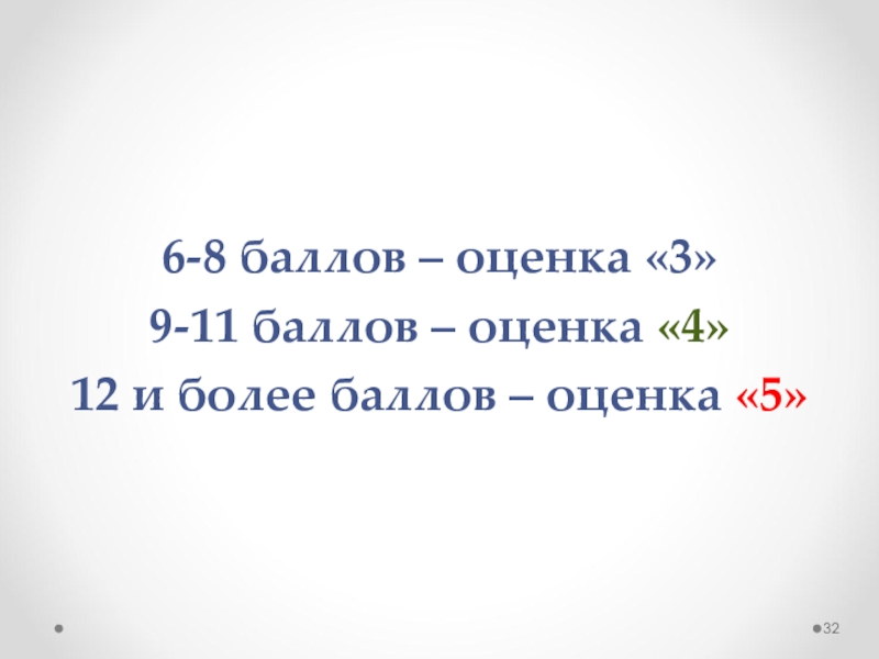 6-8 баллов – оценка «3»9-11 баллов – оценка «4»12 и более баллов – оценка «5»