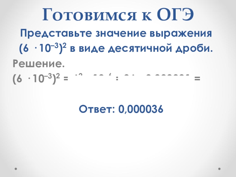 Готовимся к ОГЭПредставьте значение выражения (6 · 10–3)2 в виде десятичной дроби.Решение.(6 · 10–3)2 = 62 ·