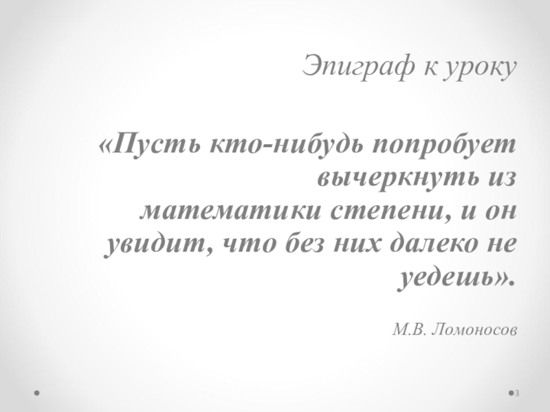 Эпиграф к уроку «Пусть кто-нибудь попробует вычеркнуть из математики степени, и он увидит, что без них далеко не уедешь».	М.В. Ломоносов