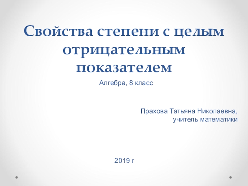 Свойства степени с целым отрицательным показателем Прахова Татьяна Николаевна,учитель математики2019 гАлгебра, 8 класс