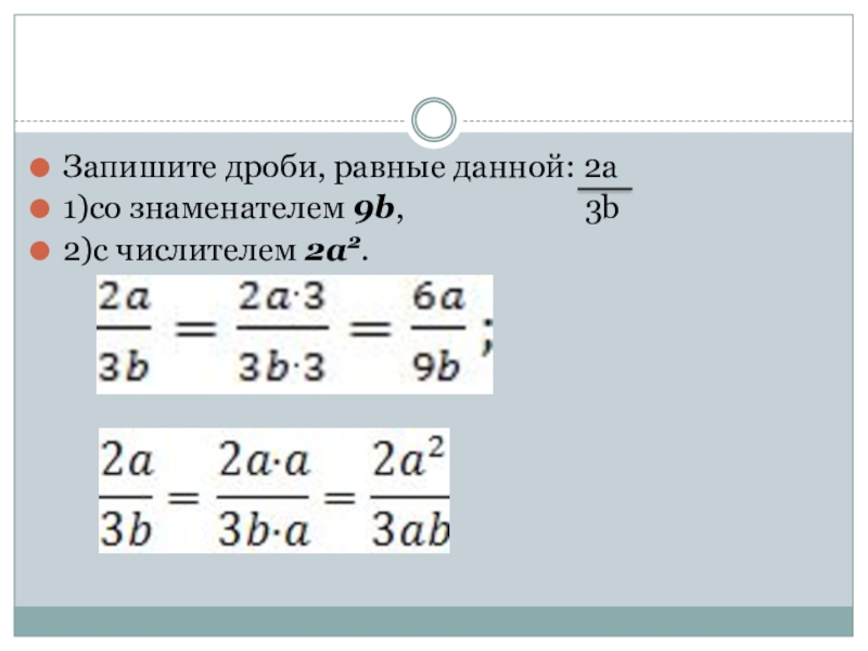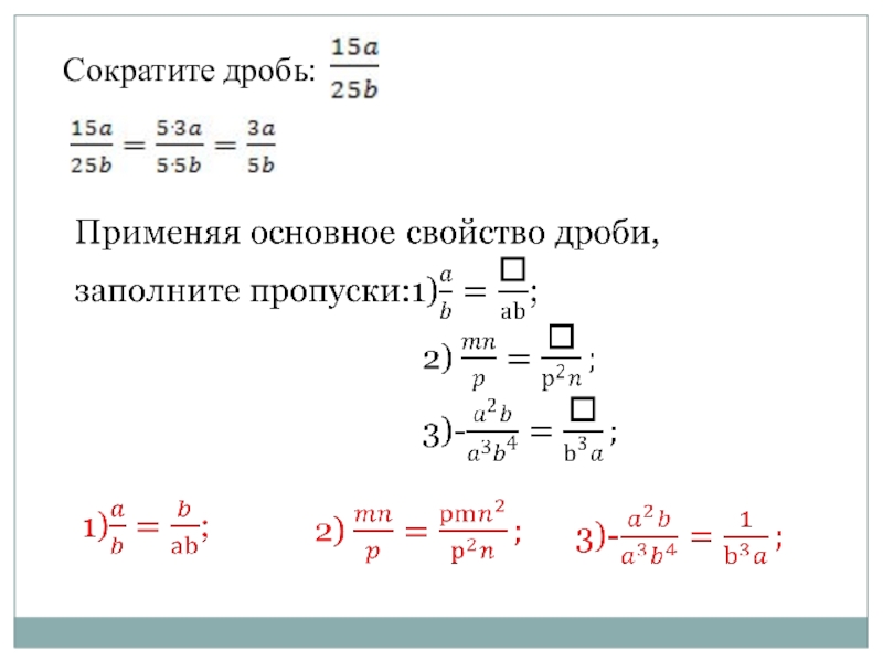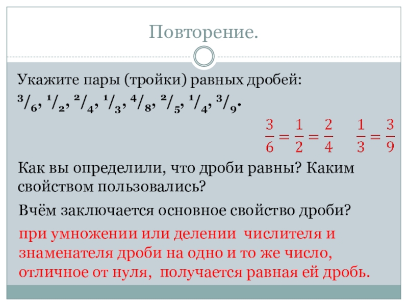 при умножении или делении числителя и знаменателя дроби на одно и то же число, отличное от нуля, получается равная ей дробь.