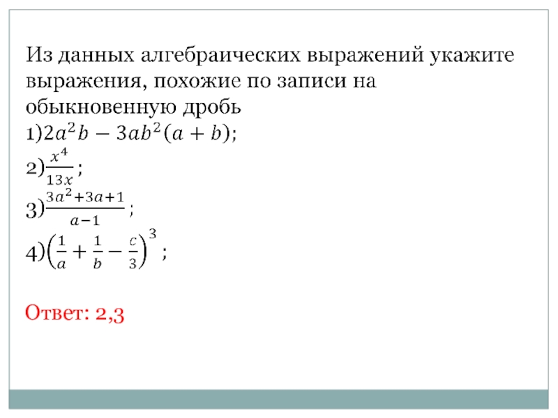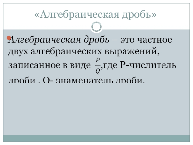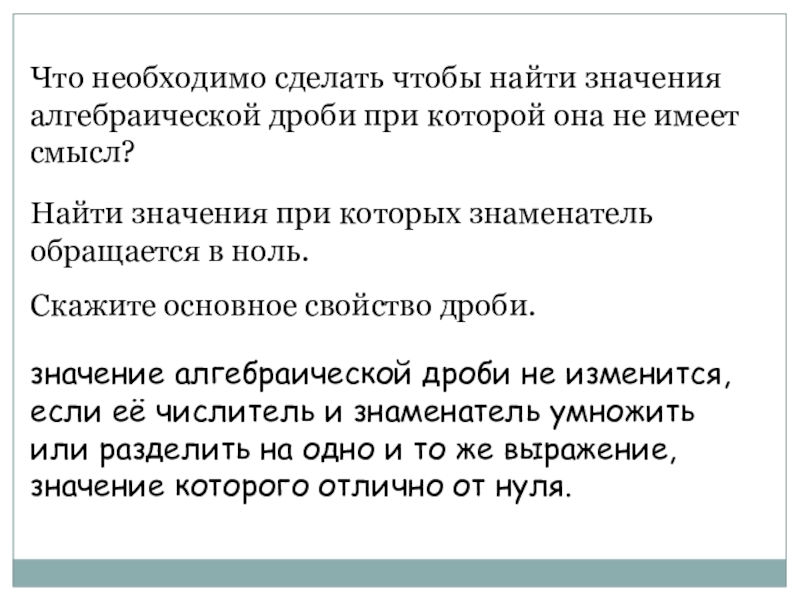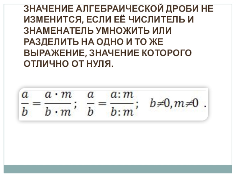 значение алгебраической дроби не изменится, если её числитель и знаменатель умножить или разделить на одно и то же выражение, значение которого отлично от нуля.